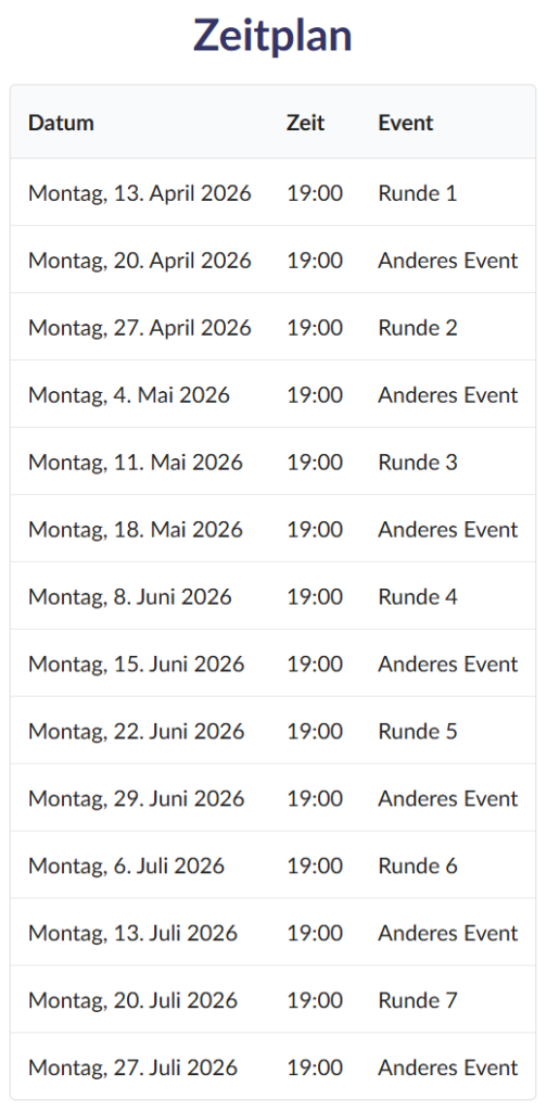 - Falls du einmal eine Runde aussetzen möchtest, gib bitte kurz Bescheid – am besten spätestens eine Woche vorher. Dann wirst du bei der Auslosung nicht berücksichtigt.